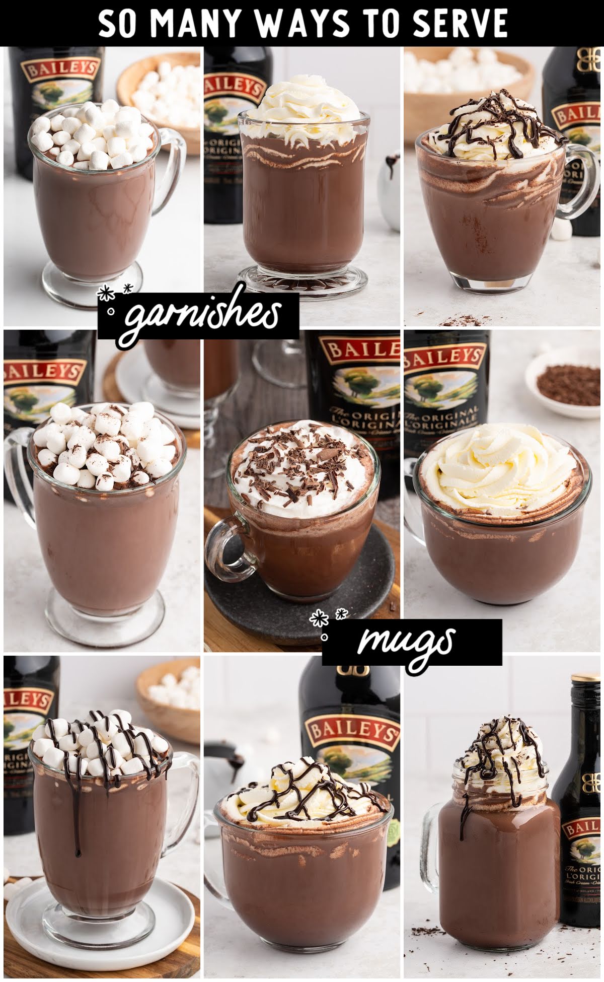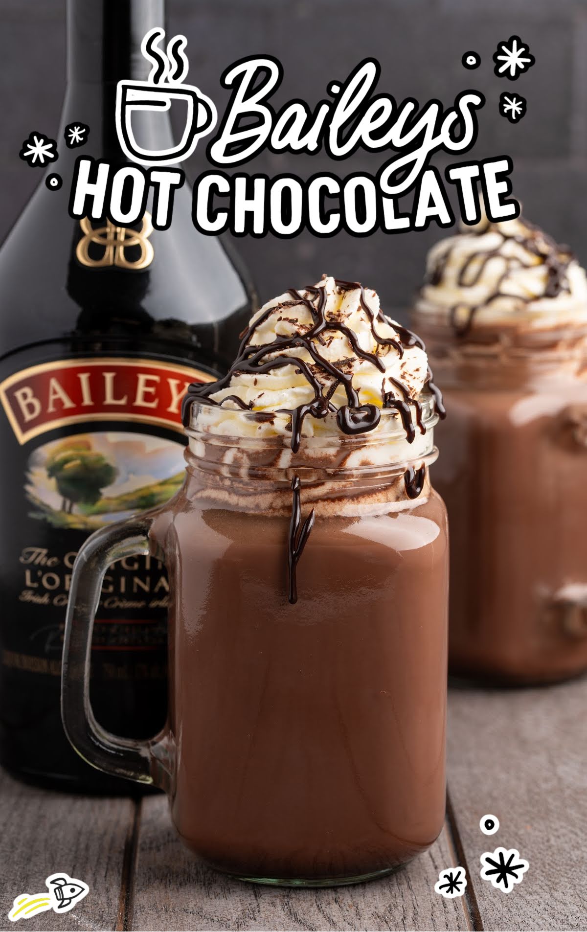 - Whisk the Baileys Original Irish Cream into the mug of hot chocolate.