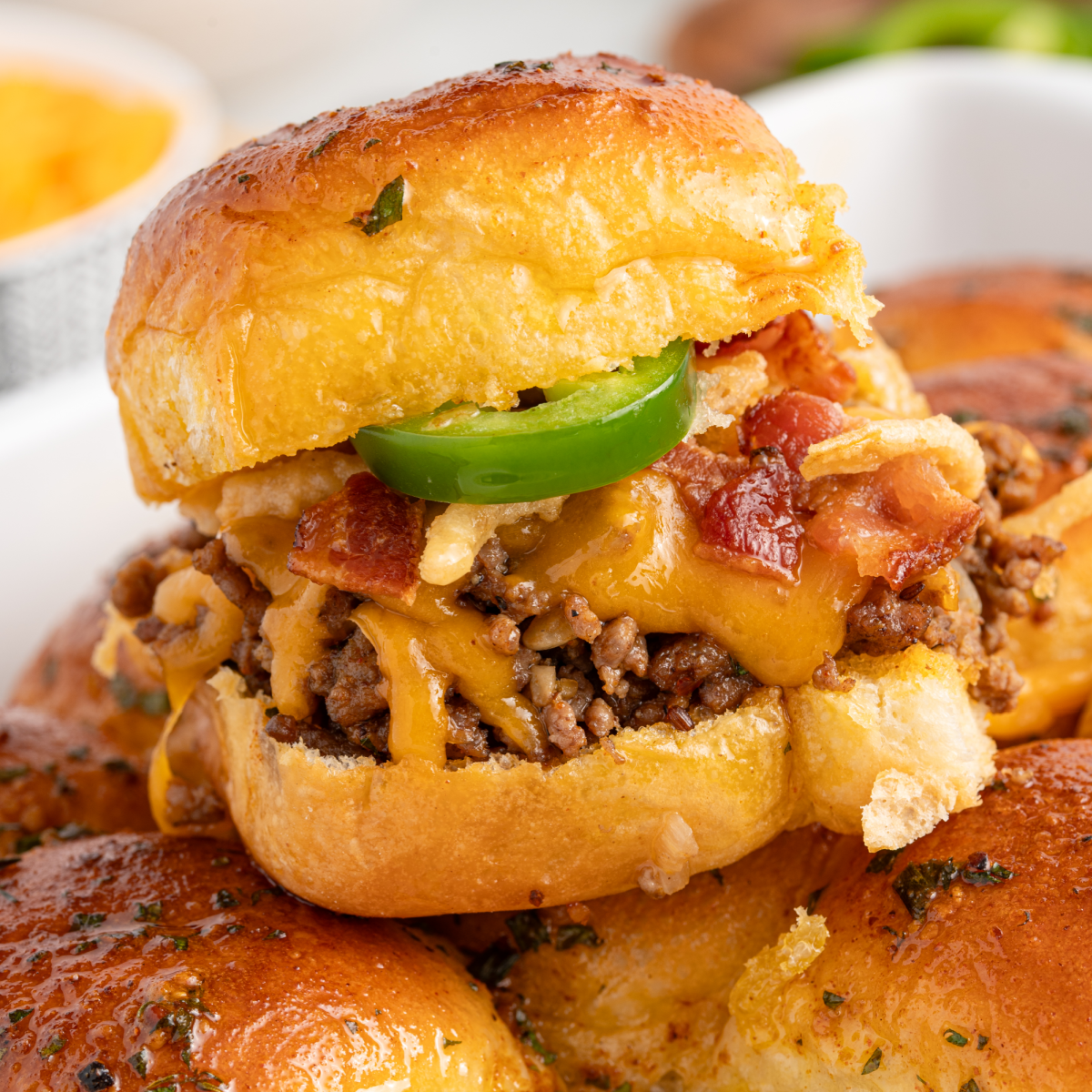 - MAIN INGREDIENTS: ground beef, King’s Hawaiian rolls, sharp cheddar cheese, crispy bacon, cowboy butter, french fried onions, jalapeno slices, hamburger seasoning