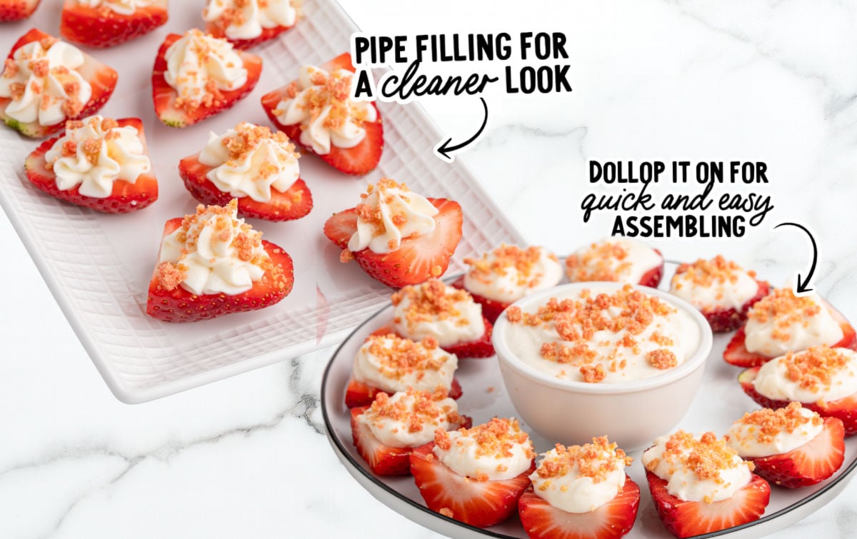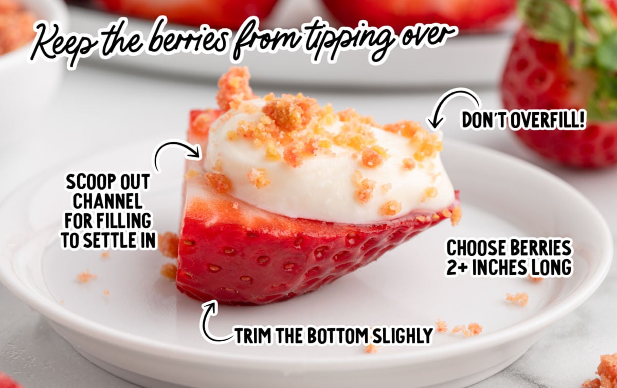 Strawberries should be sliced and filled shortly before serving. Once assembled, they’re best enjoyed the same day. The moisture from the berries will gradually impact the filling if they sit too long.