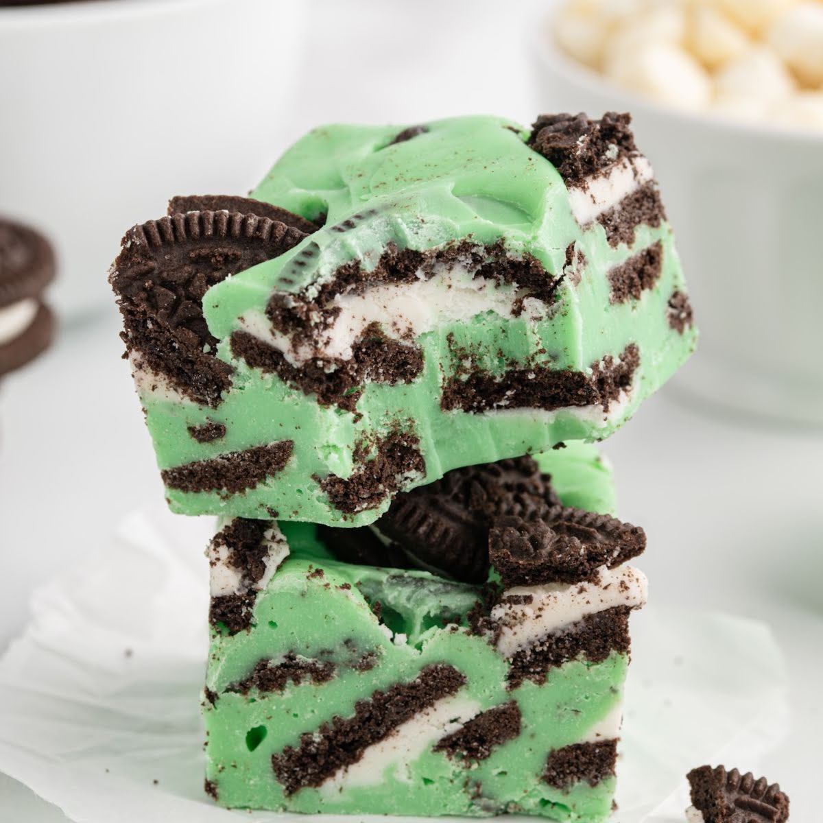 Cut the mint Oreo fudge into small squares—it’s rich, so a little goes a long way. For clean, easy slices, score the top of the fudge with a sharp knife before chilling. Once it’s set, just follow the lines and cut into neat pieces.