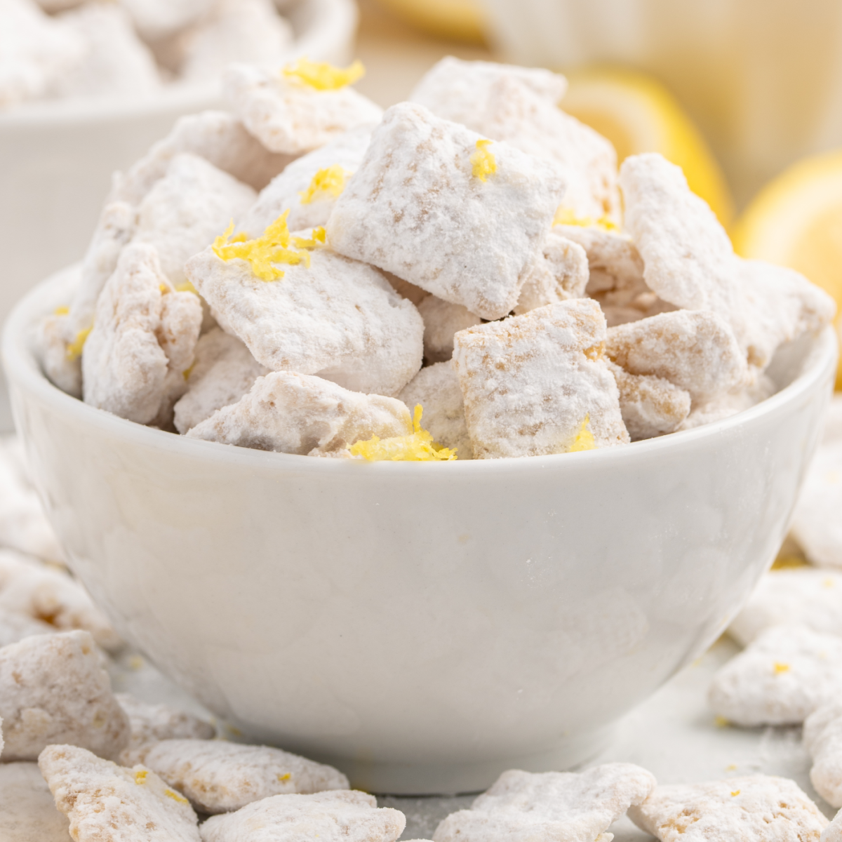 STEP SIX: Transfer the lemon puppy chow to a large serving bowl. Sprinkle the remaining fresh lemon zest evenly over the puppy chow for added flavor and a pop of color.