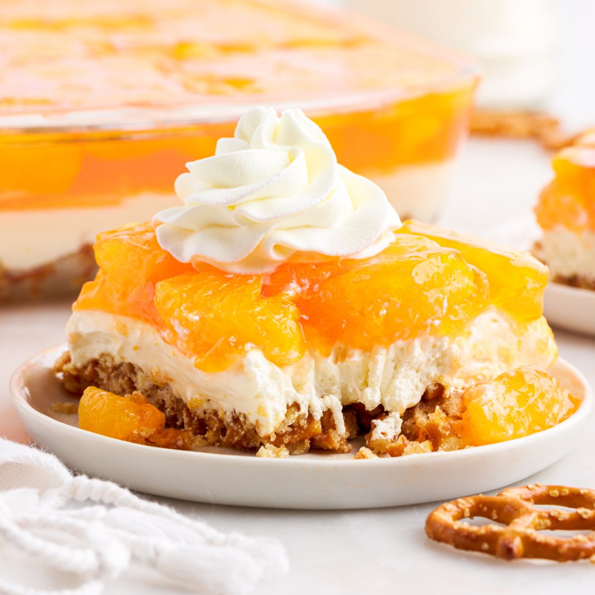 For two variations on this orange pretzel dessert, our strawberry pretzel salad and peach pretzel salad are just as easy to make.
