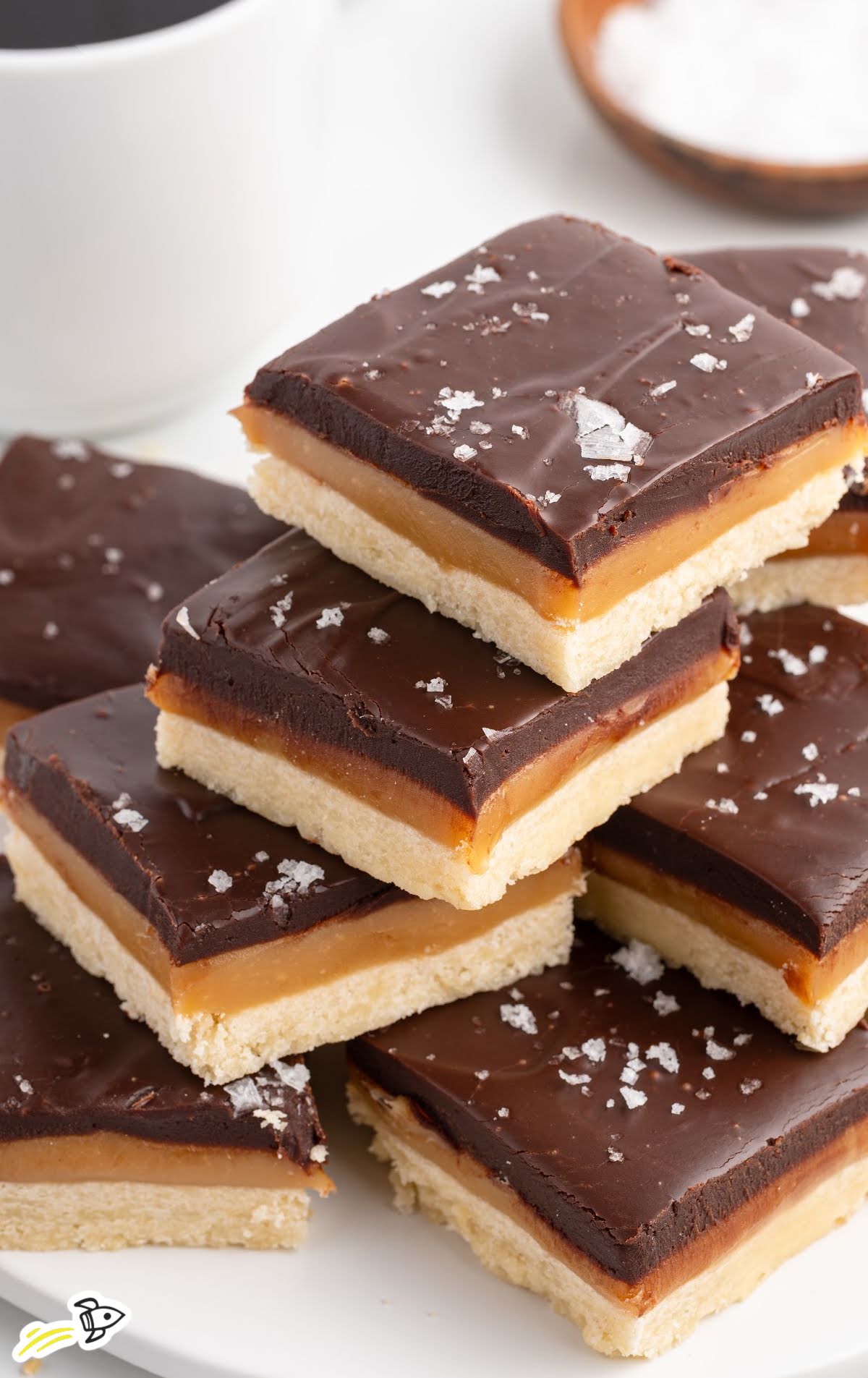 Traditional shortbread can be a little dry and crumbly — not what you want under soft caramel. The fix? A couple of egg yolks. They add just enough moisture to hold it together without losing that buttery snap.