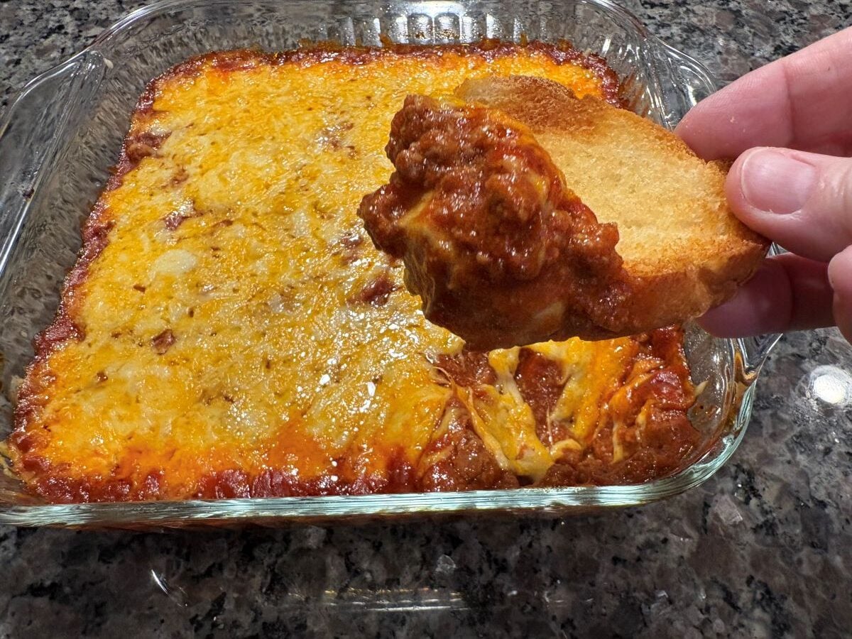 Karen and I tested it both ways: soft baguette slices turn this into a deconstructed sandwich, but toasted slices give you a sturdy platform to scoop the heavy meat mixture cleanly. That crunch is what makes this a true dip.