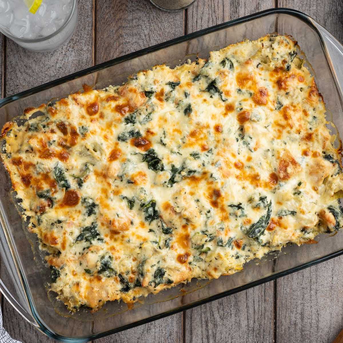 - Remove the spinach and artichoke chicken casserole from the oven and allow to cool at room temperature for 5 minutes before serving.